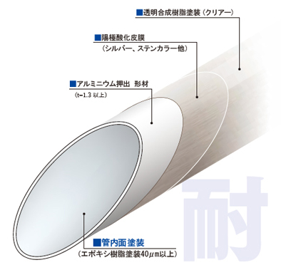 現代の建築環境では、酸性雨、塩害等に対する耐候性が求められます。【アルトイ】は金属製たてといの中で唯一、管内面塗装を標準化し、高い耐候性を有しています。塗装には有機溶剤系樹脂ではなく、水系2液形エポキシ樹脂塗料を使用することで、環境負荷を軽減しています。また、この塗料は耐屈曲性、耐衝撃性、耐摩耗性、密着性に優れており、耐久性向上にも貢献しています。