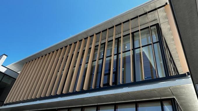 施工事例のルーバーはタテ型で電動モーターで駆動し、制御は365日対応のプログラムにより自動で行います。