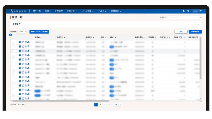 「JUCORE 見積」は、物件管理、見積管理、見込管理、予実管理、分析機能で情報を一元管理。
