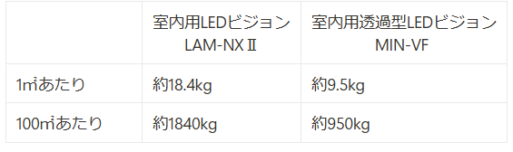 以下は、当社で取り扱っている室内向けのLEDビジョンとの重さの比較です。