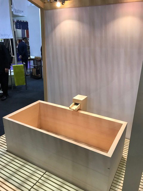 ▲檜創建株式会社様のブースには、どーんと檜風呂が展示されておりインパクトがありました!檜創建様の檜のお風呂は、多くの旅館やホテルが採用!デザインも様々でオシャレです♨