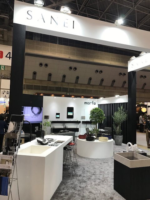 ▲SANEI株式会社様のブースには、水栓・洗面ボウルがずらっと展示されていました!