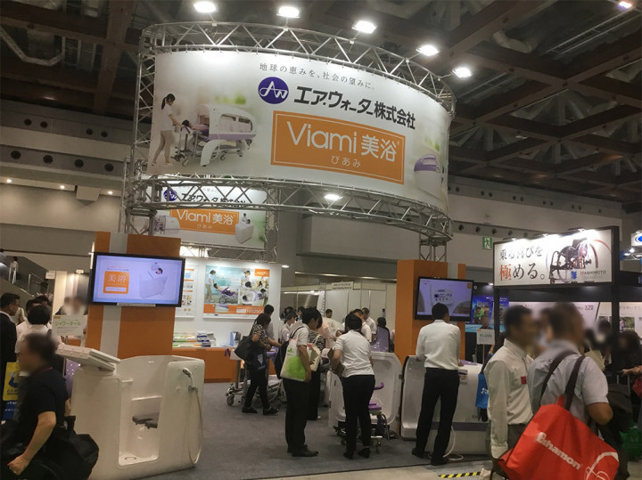 安心・安全な入浴を第一に考える「エア・ウォーター様」のブースには「美浴(びあみ)」や「シャワーオール」が触れて・見ていただけるように展示。