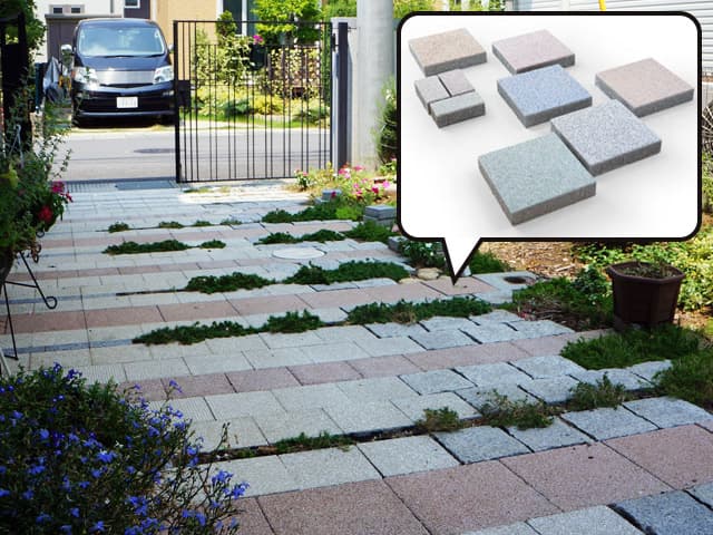 インターロッキングブロックと同様、敷き砂と目地砂だけで施工ができる天然石の舗装ブロックです。