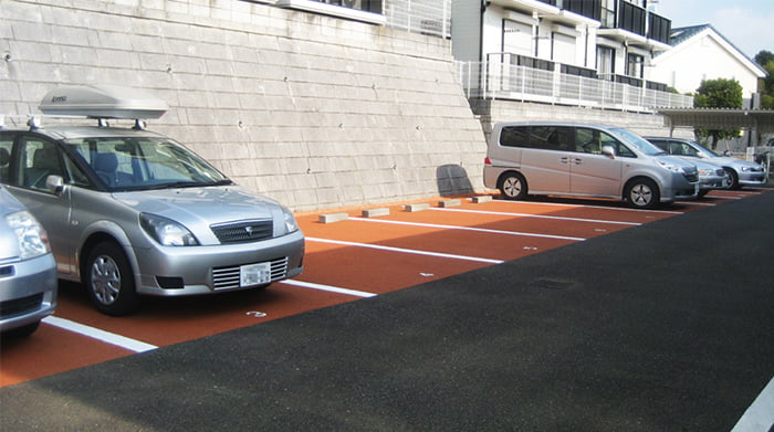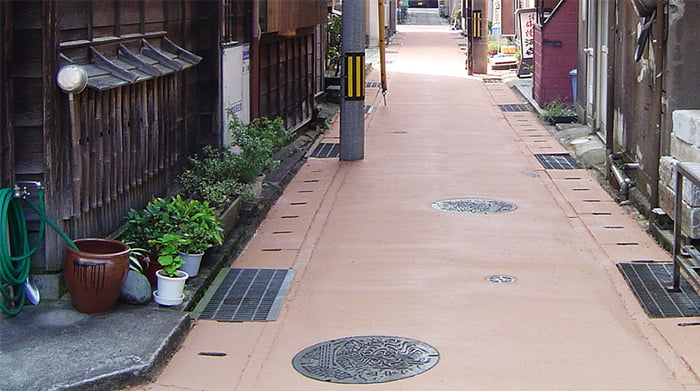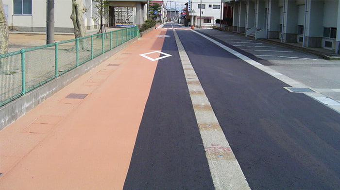 K-グランドコートは土地の都合上、歩道帯の確保が困難な路地裏や昔ながらの街並みを、見た目も鮮やかなコミュニティー道路へと変化させる事が可能です。瓦がもつ自然な色合いが明るさを加えるエッセンスになり、歩道帯・自転車帯を際立たせ、ドライバーの歩行者&自転車への意識向上に繋がります。既存の舗装に施工する事で、大がかりな工事の必要が無く、舗装のリフレッシュが出来ます。また、近年では歩道と自転車道を分ける事が推奨されており、そのような場所に最適です。