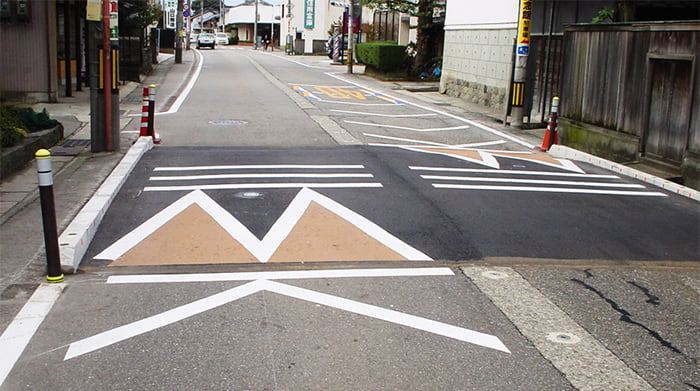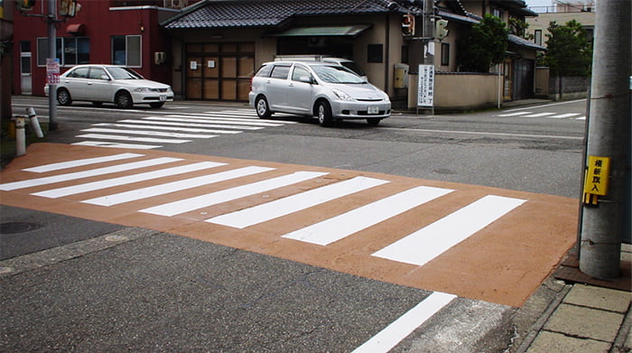 耐久性は道路標示用塗装規格を十分満たしており、すべり抵抗値も高く、車道や坂道にも適用可能です。