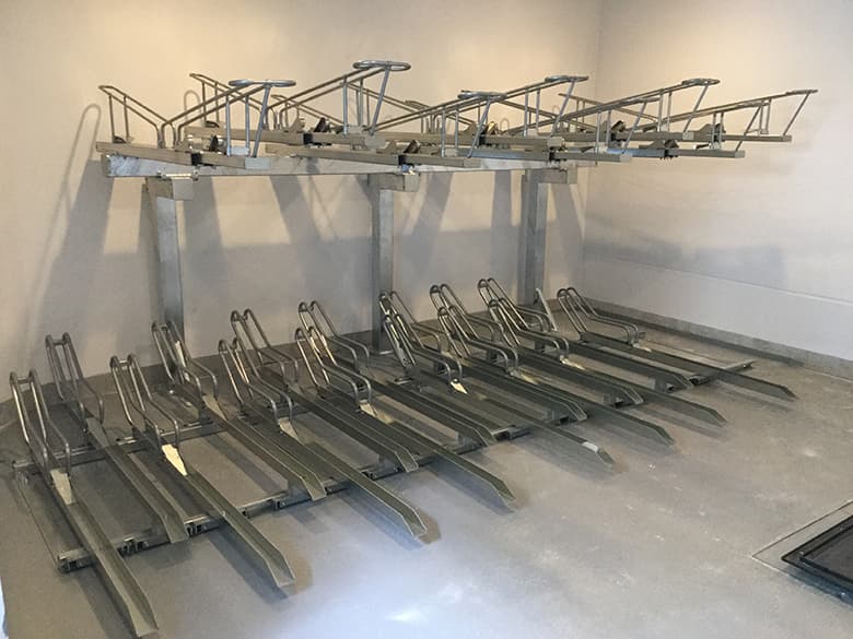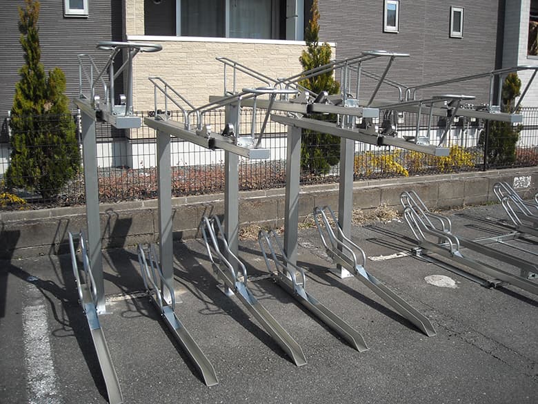 ラックが左右自在にスライドし自転車の出し入れがスムーズに行え、かつ、収納台数が大幅に増えます。ラックビッチは200mm以上です。20〜27インチの自転車まで収納できます。