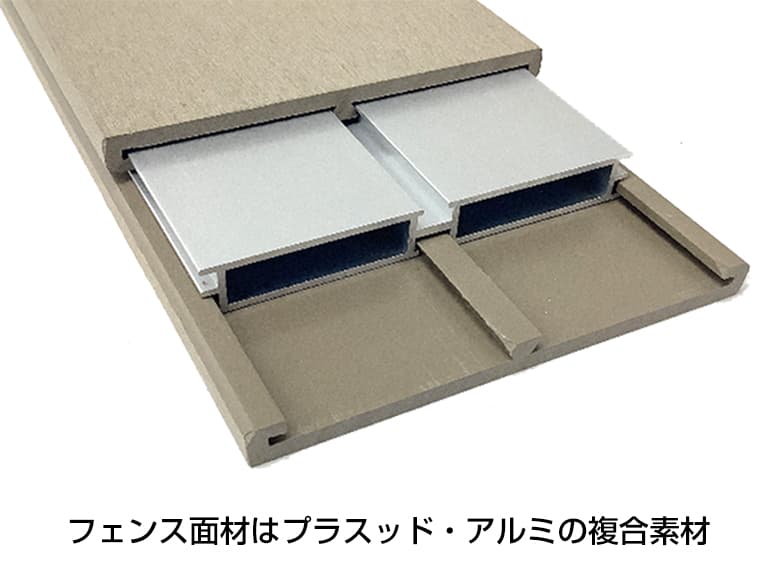フェンスの面材には、表面はささくれや変色が少なく定期的な塗装が不要な再生木『プラスッド』、内部には部材の強度を支えるアルミを使用しています。