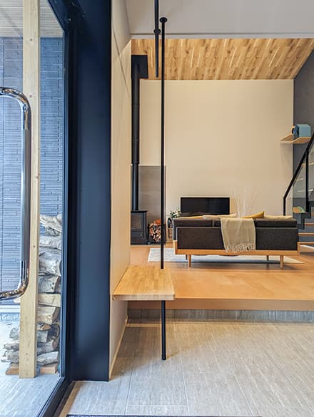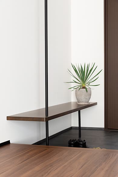 さらにカツデンの『玄関ベンチ』は、靴の脱ぎ履きのタイミングで掴むための縦手すりが通っており、一連の動作をスムーズに行えるよう配慮されています。