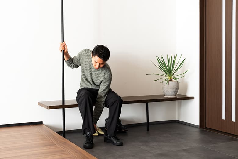 ふとしたときに握れる縦手すりを付けたことで、日常でストレスを感じる「立ったり座ったりする動作」が楽になるため、主に靴を脱ぎ履きする玄関で利用されることを想定しています。