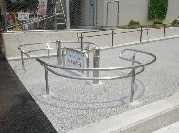 公園や商業施設の入場ゲート口などに設置される事が多い、車椅子や徒歩での入場は制限せずにバイクなどが勝手に入場する事を制限するステンレス製の人と車椅子入場ゲート。