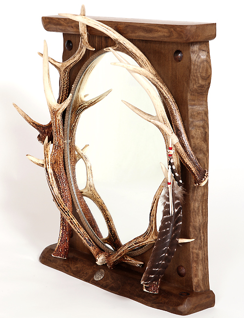 ■ミラー部は、大小の鹿角に覆われ、縁取りには、カウボーイの生皮で編みこまれたローピングロープを使用。台座は、川底の土中に長い年月埋もれていた、埋もれ木を10年以上乾燥させた物から作りだしたと言う凝ったもの。