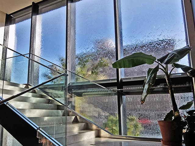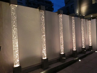 ガラスや石壁面に水の流れを表現、空間に動きを演出