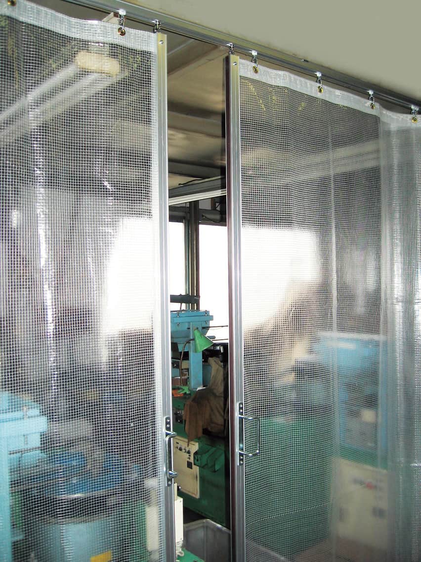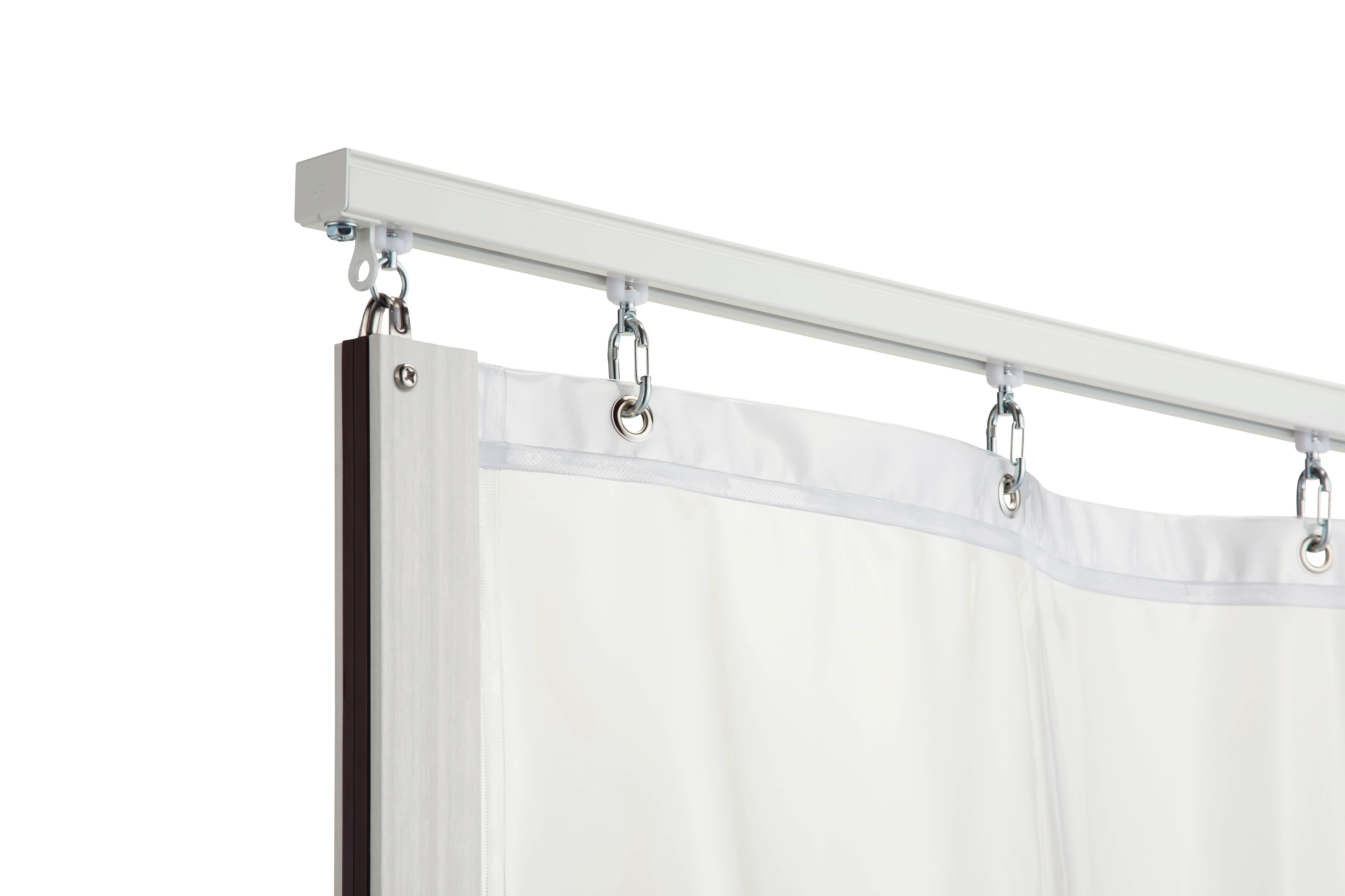 OS間仕切ポールは、工場、作業場、倉庫、店舗等の出入り口や間仕切り用のカーテン(シート、ネット)の先頭に取付け、操作性、見映えをアップします。密封性も高く、節電・省エネ対策に効果を発揮します。