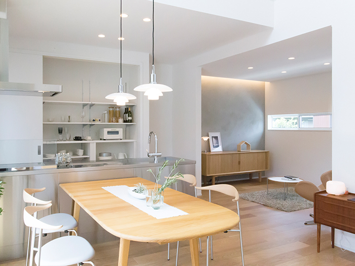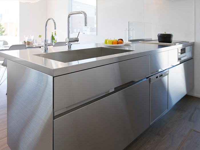 ステンレスを全面に採用し、無駄をそぎ落としたデザインで素材の上質感を際立たせています。扉やサイドパネルは小口が見えないように留め加工をほどこすなど、細部にまで配慮することですっきりとしたイメージを徹底。オールステンレス(※)なので清潔にお使いいただけます。