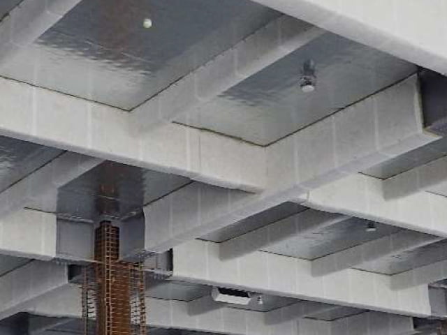 火災時に鉄骨造の骨組みが変形・倒壊するのを防ぐために、耐火性・断熱性の高い耐火被覆材で鉄骨を覆うことにより、鉄骨の温度上昇を抑えて火災時の延焼を遅らせます。