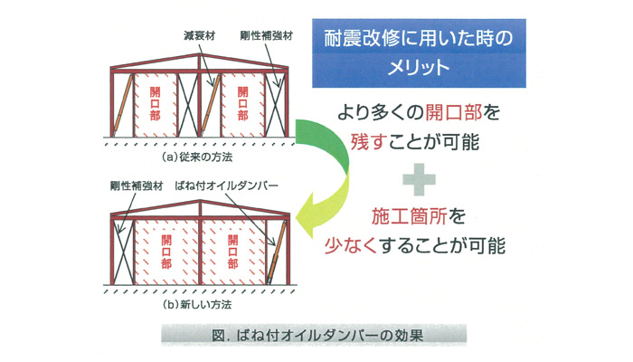 ■鉄骨造建物の耐震改修に用いることにより、従来の耐震改修の方法より多くの開口部を残すことが可能となります。また、施工箇所が少なくなることによって施工期間の短縮や工事費の削減も見込まれます。