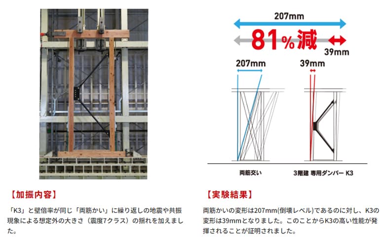K3は、震度3~4程度までは耐震壁として機能し、それ以降は制震ダンパーとして効果を発揮します。