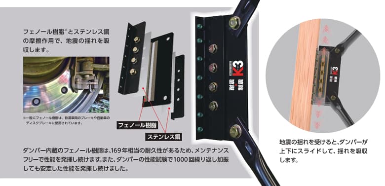 制震ダンパーにはゴム(粘弾性)やオイル(粘性)や金属(履歴)などさまざまな機構のものがありますが、K3は摩擦材を利用した摩擦ダンパーです。