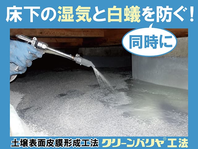 『クリーンバリヤ工法』は、床下土壌表面に皮膜を形成して「防湿工事」と「防蟻工事」を同時...