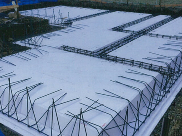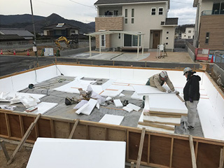 ベタ基礎工事の耐圧盤下に設置する断熱材工事、施工精度の均一化・作業のスピードアップを図...