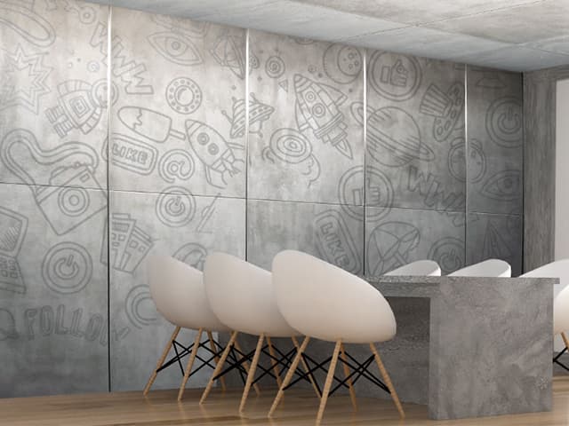 加工性に優れる不燃・ケイカル板にNC加工・UV印刷を施し、デザインの可能性を広げる。