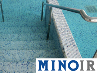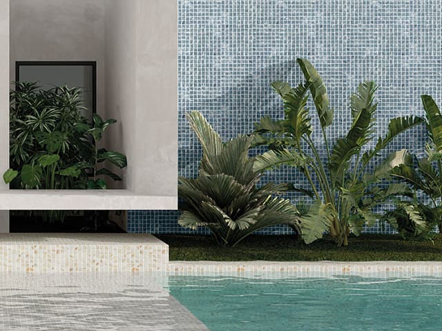 水のある空間に寄り添う色彩をイメージしデザインされたガラスモザイク
