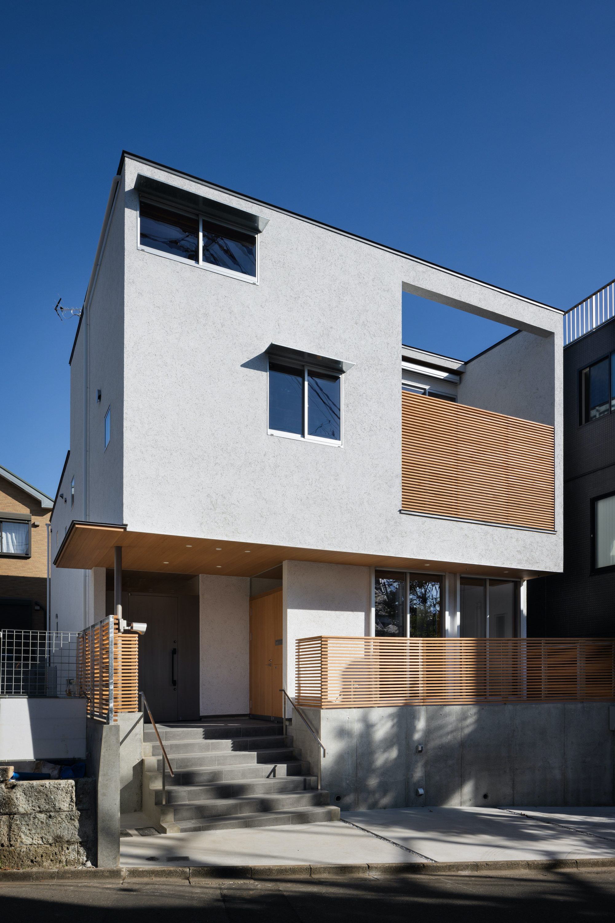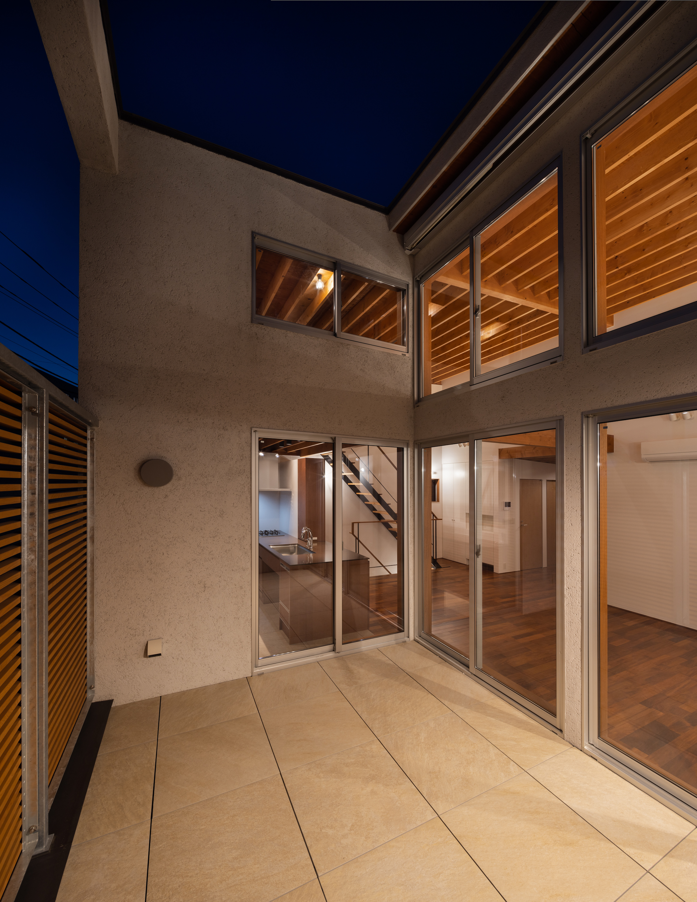 旧宅には塀で囲まれプライバシーが保たれた大きな庭がありました。テラスはこれを引き継ぐものとして考えようとしました。テラスは木製のルーバーでプライバシーを保ち、大きな開口でリビングと繋がりを持つ青天井の部屋のイメージで計画しました。かつての庭のような広さは取れないのですが、そのかわり他の空間への視覚的な広がりを取ろうとしました。