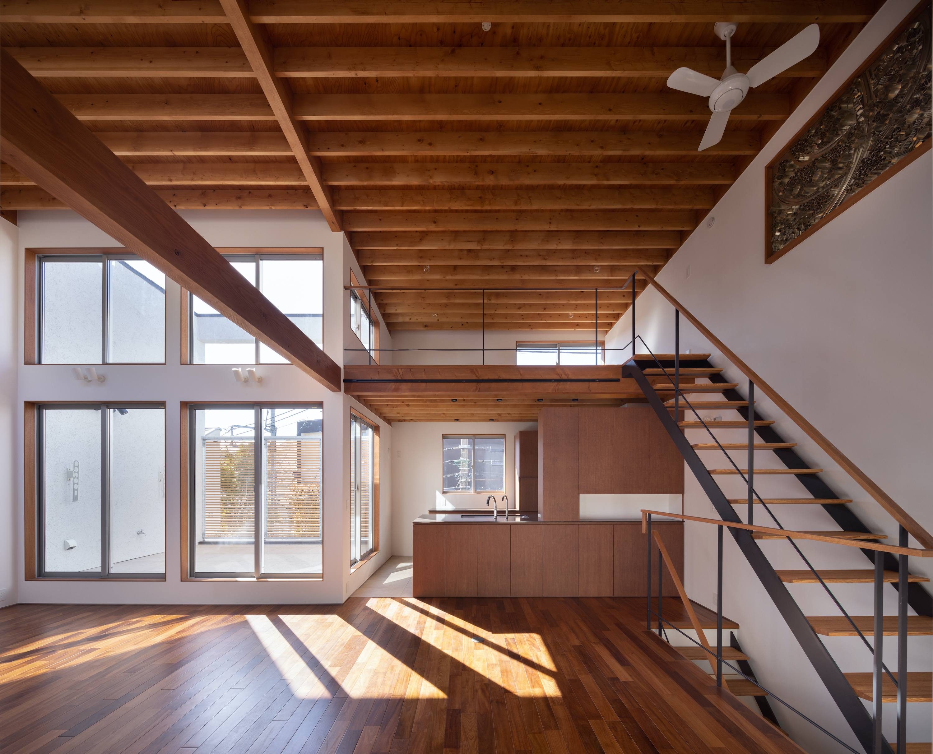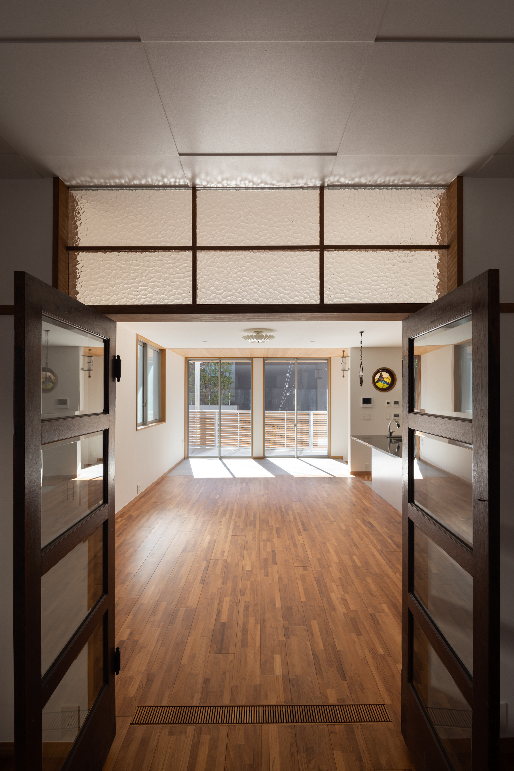 また、ステンドグラス、ガラス、扉、照明など様々なものを旧宅から引き継いでいます。設置場所を見つけることができなかったアルミの大きなレリーフは2階の世帯が引き継いでくれることになりました。2階の主空間であるLDKには一層半の階高を与えています。リビングダイニングは階高を生かしたおおらかな空間としています。