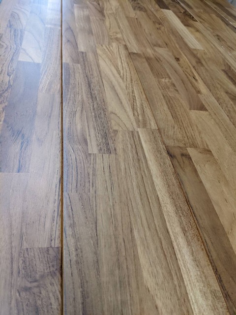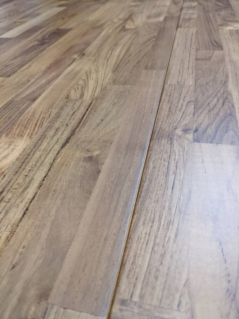 縦方向に短いピースを繋げてつくられた定番ユニタイプの生産時に出て来る端材を利用して作られたのが、今回のFJLタイプ(縦方向にフィンガージョイントで繋げて長い材をつくり、横の方向を横剥ぎ集成をして作成したフローリング)です。植林木でかつ端材利用との事で、ダブルでエコな材料となります。チークという高級材料を使用しながらコストパフォーマンスも発揮出来る商品でもあります。