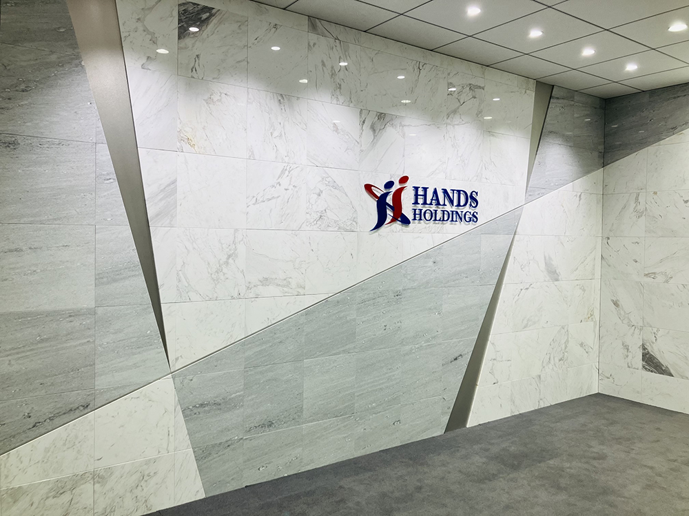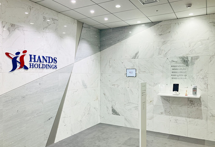 東京本社を移転することになった事がきっかけです。親会社であるハンズホールディングス株式会社をはじめとする、グループ会社全てをワンフロアに集結させグループ間の結束を強めるというテーマでプロジェクトが進みました。そんな中でも、今回石材を使用したエントランスは、会社の顔であるため特に力が入っていました。