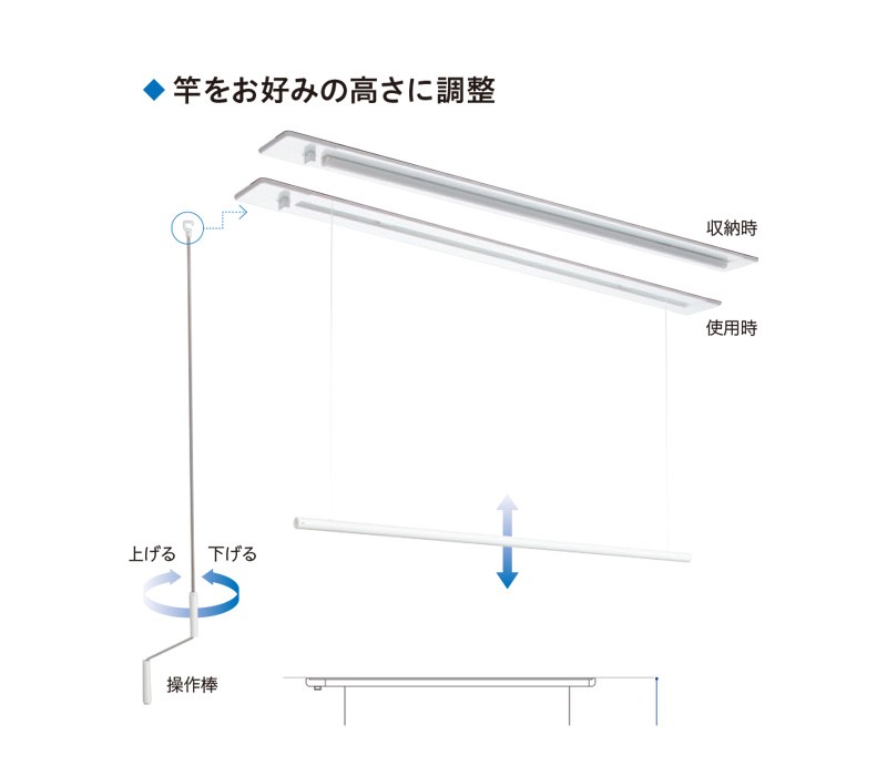 低い位置に下ろせば、子供や身長の低い人でも楽に洗濯物を掛けられ、天井近くに上げれば掛けた洗濯物が邪魔になりません。