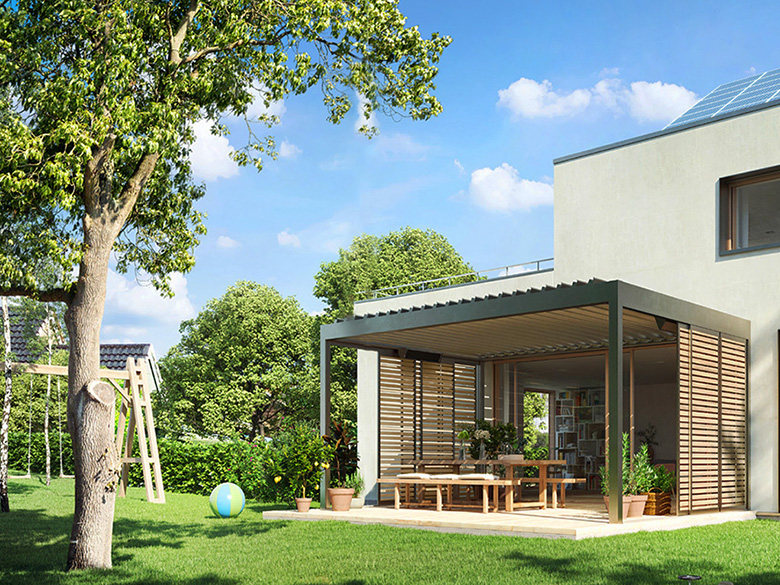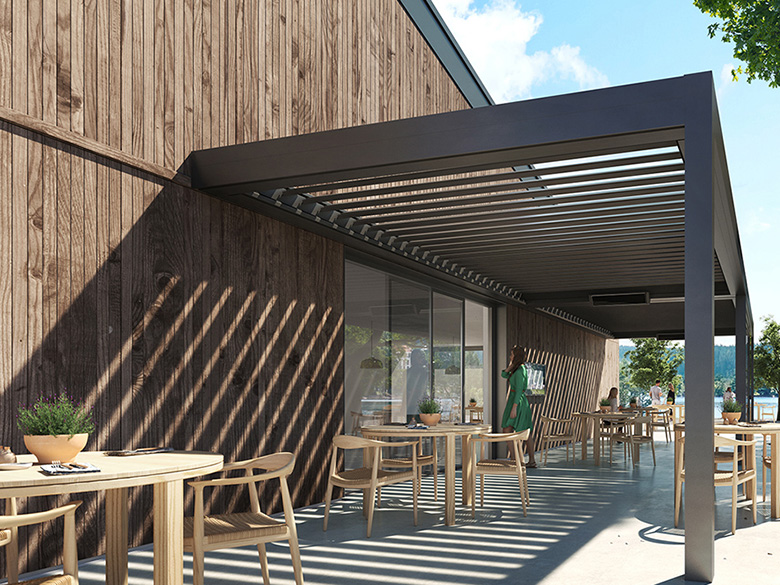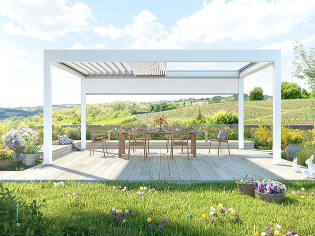 さまざまなオプションを追加することが可能で、あなた好みのガーデンルームにカスタマイズできます。屋根はアルミ製のスラットで、ボタン1つで開閉を自由におこなうことができます。