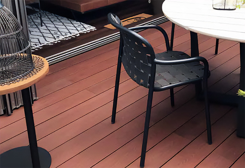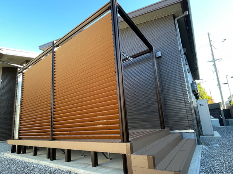 「ハイブリット彩木」は、リビングのフロアと高さを調整できるためガーデンルームのようなスムーズなアプローチが可能です。人工木を使用しているので、メンテナンス回数を抑えることができます。