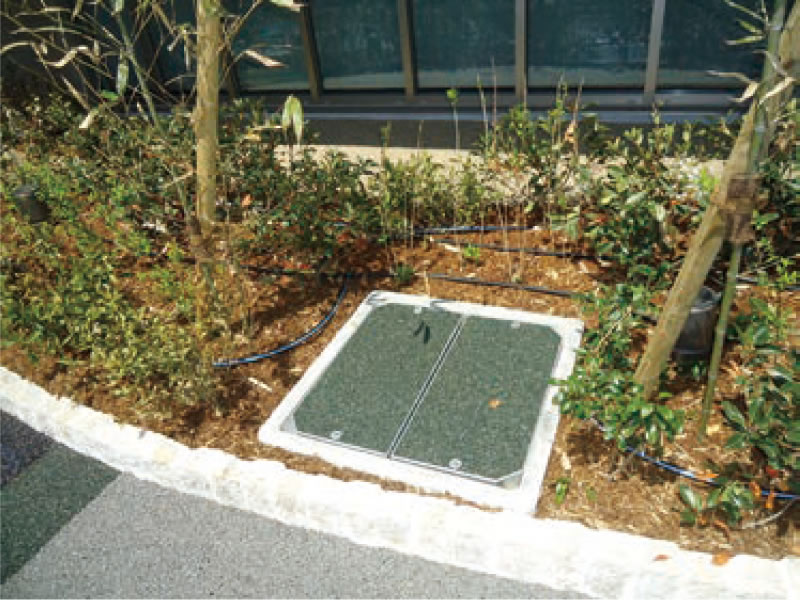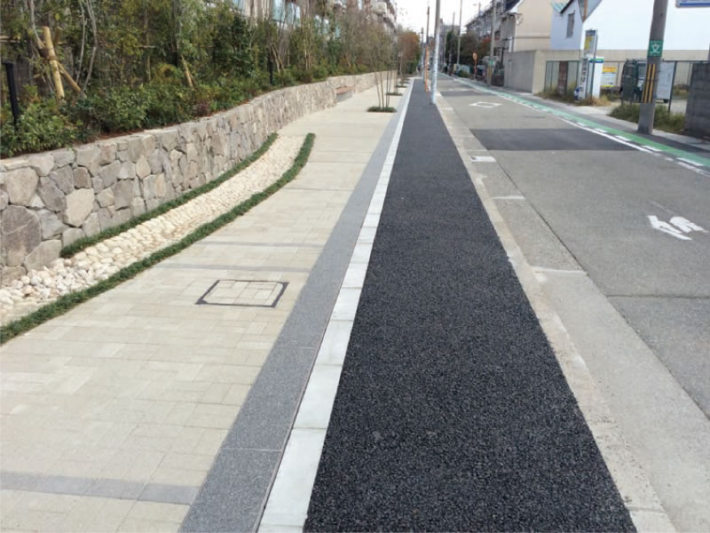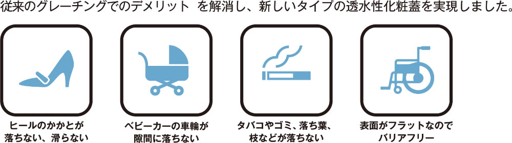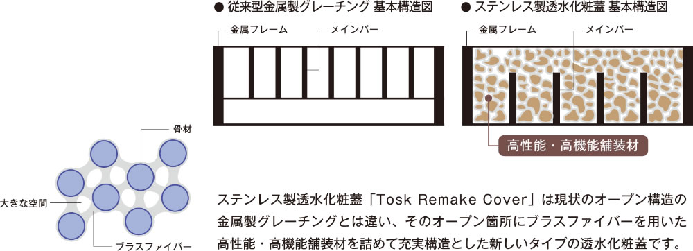 従来の金属製グレーチングに代る製品として、オープン開口部を、特殊ファイバーを用いた天然石を詰めた構造とし、表面はフラットで、安全性と滑りを軽減、且つ透水性に優れ、景観性も兼ね備えた新しいタイプの側溝用、集水桝用の化粧ふたを実現した製品です。
