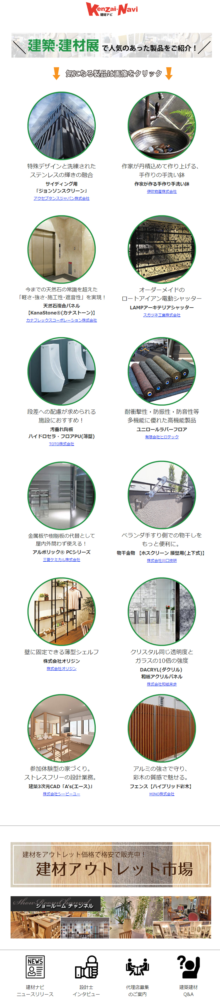 建材ナビは800社を超えるメーカーの製品を200以上のカテゴリーに分類した建築材料専門の検索サイトです。