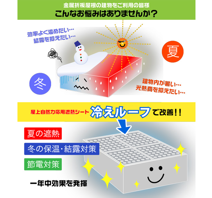 寒さの影響を受けやすく、頭を悩ませる機会も増えてきております。『 冷えルーフ 』は、そのような金属折板屋根の悩みを解決する為に開発された遮熱・断熱システムです。