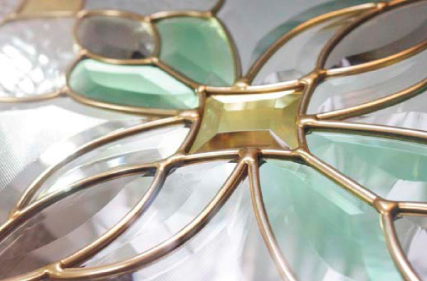 当社の商標ブランド「ピュア・ステンドグラス」は、通常の3mm厚の色ガラスに加え、5mm厚の「面取りガラス」を採用しています。「面取りガラス」は、色ガラスのフチを削って磨き、光の乱反射で輝くもので、立体的な美しさを醸し出します。