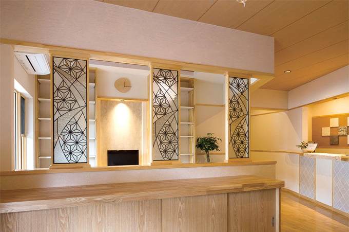 衝立に組み入れた特注品です。気品ある「和」のテイストを施したことで印象がグレードアップしました。