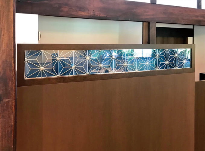 旅館のエントランスに「麻の葉」3枚を連結的に組み入れた事例です。規格品ですが、オーダーで設(しつら)えたような仕上がりで、宿泊のお客様からも大好評との嬉しいお言葉も頂戴しております。