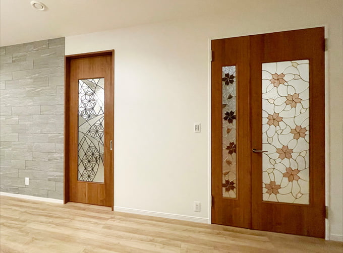 左側の引き戸は「麻の葉模様」、右側の親子ドアは「桜」と、和風のモチーフで統一した施工例です。色数を絞ることですっきりとしました。