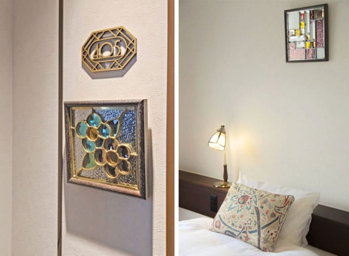プレミアムフロアに既製品を活用いただきました。こちらのホテルでは大正時代へタイムスリップしたかのような雰囲気を感じることができます。ホテルのコンセプトにあった既製品をお選びいただき、背面にミラーを用いたミラーステンドグラス仕様にすることで、壁に掛けてもキラキラと光り輝く仕上がりになりました。