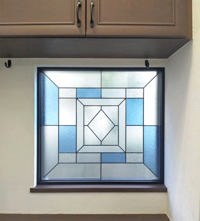 玄関わきの飾り窓に、ブルーが爽やかな幾何学のデザインの特注品を施工しました。図案はお客様ご提案のもの。使用するガラスもご自身で選定された、シンプルながらこだわりの詰まった逸品です。