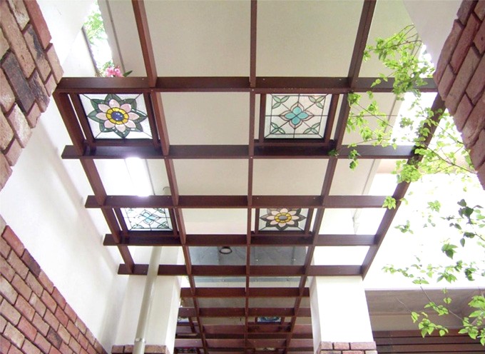 中庭の屋根ポートに部分的にアレンジしました。屋根すべてを覆いつくしたものではないので、明るさを確保しつつ美しい色合いで照らしてくれます。