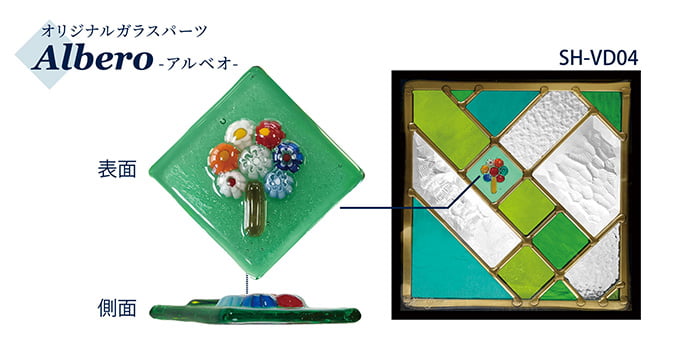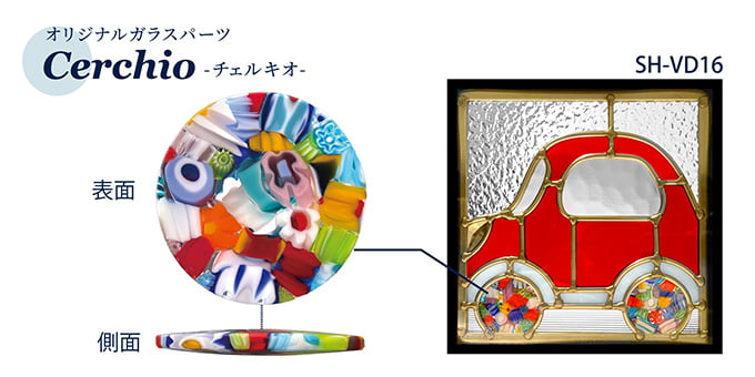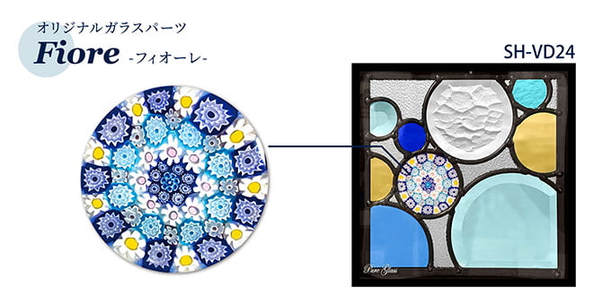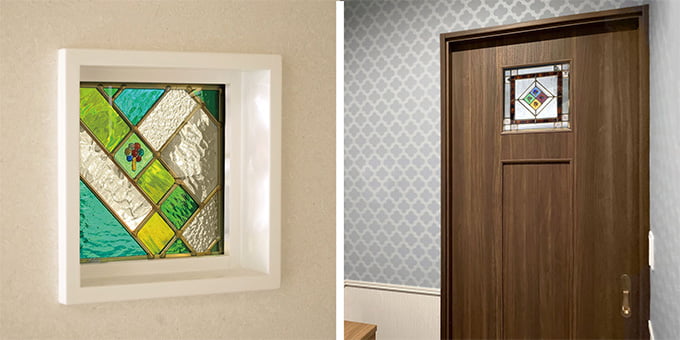 一般にアクセサリーやランプ・小物で愛用されるヴェネツィアングラスを、ステンドグラスの一部として用いたことで、インテリア装飾はもちろん、「窓」「ドア」「室内壁」などの内装でもお楽しみいただけます。(特許出願済)
