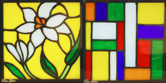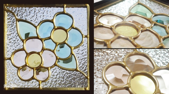 〇色ガラス1枚1枚を鉛で繋ぎ合わせた本物のステンドグラスです。鉛でガラスを接続しているので、細かいデザインも可能となります。またステンドグラスの両面を強化ガラスで挟み込んでいますので、安全性が高く、小さなお子様がいるご家庭でも安心して使うことが出来ます。