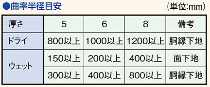 (曲面施工には、5・6・8㎜をお使いください。曲率目安は下記をご参照ください。)