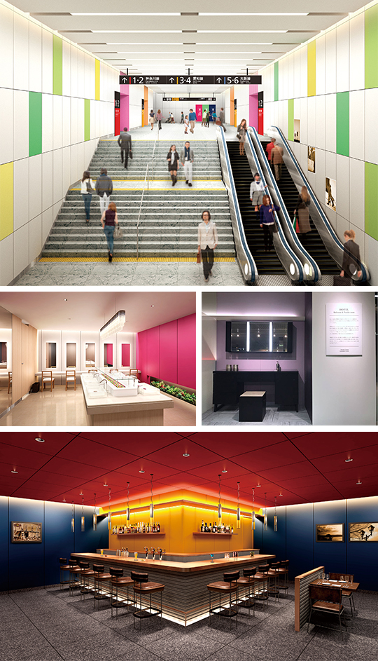豊富なカラーバリエーションから、存在完のある「ビアイエロー」などを用い、木やタイルなどの異種素材をバランスよく組み合わせることで、壁面の新しい魅力を惹き出しています。