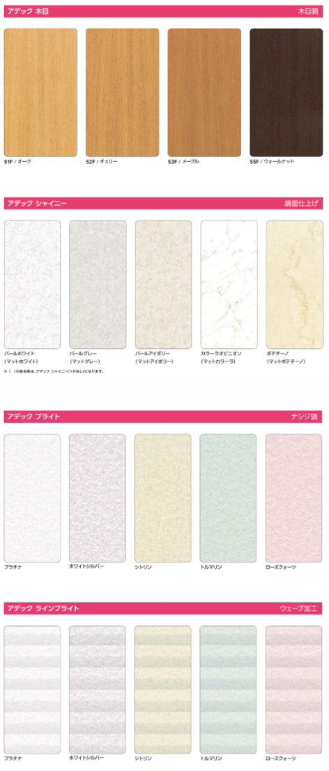 鏡面、気品のあるパール調などデザインも豊富。キッチンやサニタリー(トイレ・洗面所)からリビングやモダンな和室まで、また住宅に限らず店舗やエントランスなどの壁面などにも使い方は自在にひろがります。