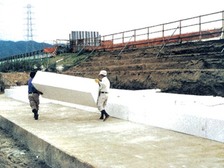 大型の発泡スチロールブロック(EPSブロック)を積み重ねることで軽量な盛土体を構築でき、急速施工にも対応できる工法です。